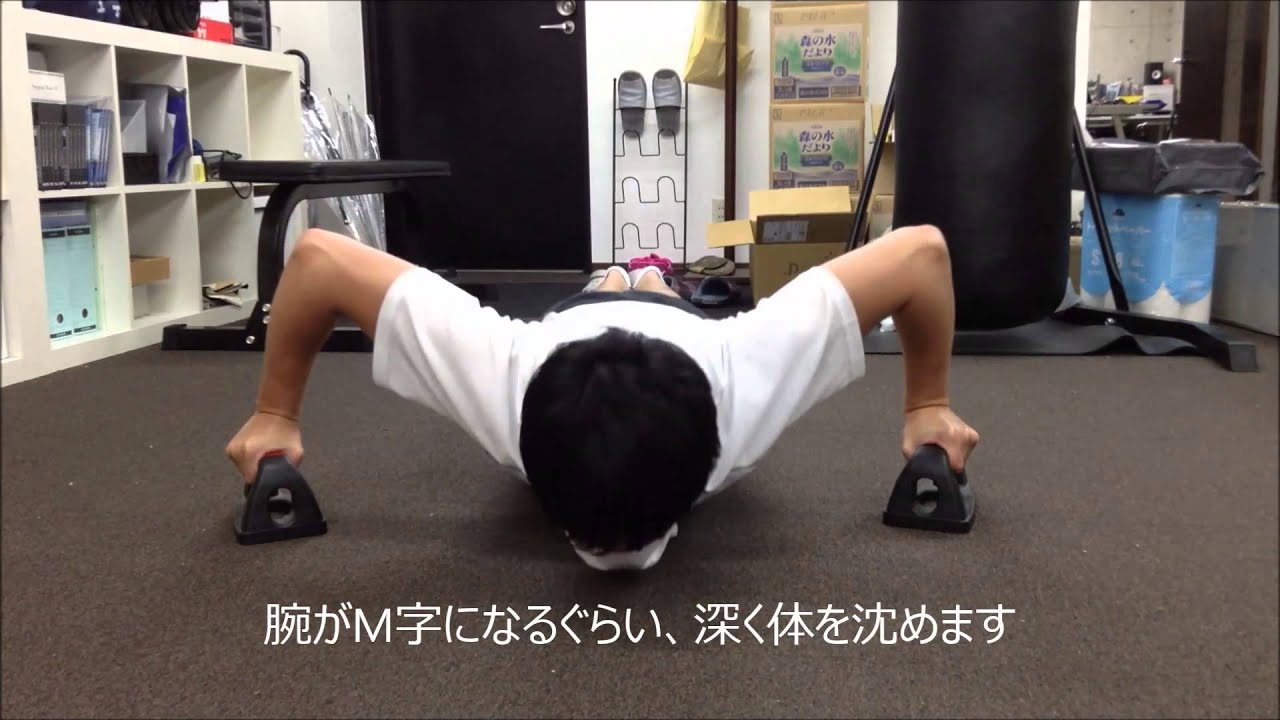 通常の腕立てよりも深く体を沈めるので、かなりきつくなります。
